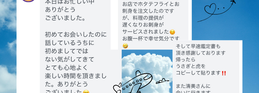 Iさん、遠くはるばる飛行機に乗って鑑定を受けに来てくださり、ありがとうございました。